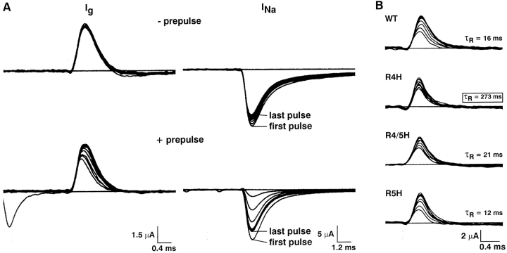 Figure 5. Recovery from fast inactivation of macroscopic ionic and gating currents. (A) Recovery of WT gating current (Ig, in the presence of 2 μM TTX) and ionic current (INa, in the absence of TTX) obtained from different oocytes. Pulse protocol: a 100-ms prepulse to 0 mV from a holding potential of −100 mV was followed by a recovery period of variable duration (2–90 ms) at −100 mV. Test pulses have a duration of 80 ms (ionic current) or 13 ms (gating current) and responses are superimposed for all recovery periods. For the calculation of the recovery time course, the current traces with prepulse were routinely normalized to the current traces without prepulse in order to compensate the slight decrease of the current amplitude during pulse series. The series of increasing recovery times, starting from 2 ms, where INa is almost totally inactivated, was preceded by the longest recovery time where the plateau of recovery is observed (first and last pulses are indicated in INa recordings). (B) Gating current recovery of WT and mutant sodium channels at −100 mV. Pulse protocol was as described above. The time intervals for recovery were between 10 and 1,250 ms for R4H and between 2 and 90 ms for WT and the other mutant channels. The recovering gating charges were fitted to a single exponential with corresponding recovery time constants (τR) as indicated. Notice the different levels of the nonimmobilized gating current fraction at the onset of recovery, reflecting the different degrees of immobilization. |