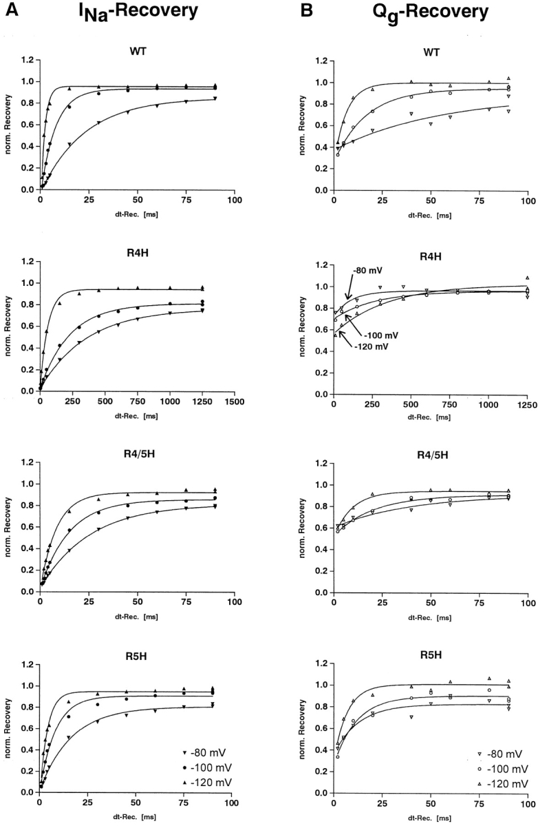 Figure 6. Comparison of the recovery of ionic current and gating charge of WT and mutant sodium channels at different potentials. Sodium current recovery (left panel) and gating charge recovery (right panel) at recovery potentials of −80, −100, and −120 mV in WT-, R4H-, R4/5H-, and R5H-sodium channels. The data of each subdiagram were recorded from different oocytes and normalized as described in Fig. 5. Notice the different starting points of gating current recovery in R4H that strictly depend on the effective recovery potential (indicated by arrows). Corresponding sodium current (INa) and gating charge (Qg) recovery time constants obtained from single exponential fits are as follows (INa/Qg in ms): WT, 22.8/54.9 (−80 mV), 7.6/16.7 (−100 mV), 2.1/6.4 (−120 mV); R4H, 359/113 (−80 mV), 228/269 (−100 mV), 59.7/349 (−120 mV); R4/5H, 25.4/39.7 (−80 mV), 14.9/20.6 (−100 mV), 8.4/9.5 (−120 mV); R5H, 16.3/12.6 (−80 mV), 8.0/11.6 (−100 mV), 3.8/6.9 (−120 mV). |