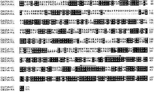 FIG. 1. Comparison of human and Xenopus Cdc25A. The predicted amino acid sequence of the Xenopus Cdc25A (525 residues) cloned as