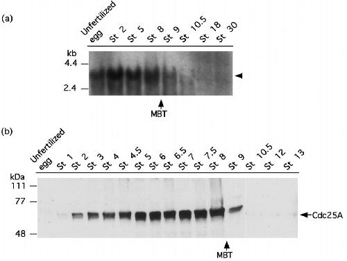 indicated on the left. (b) Western blot analysis. Eggs or staged embryos were homogenized in 10 vol of EB (Hartley et al., 1996) and