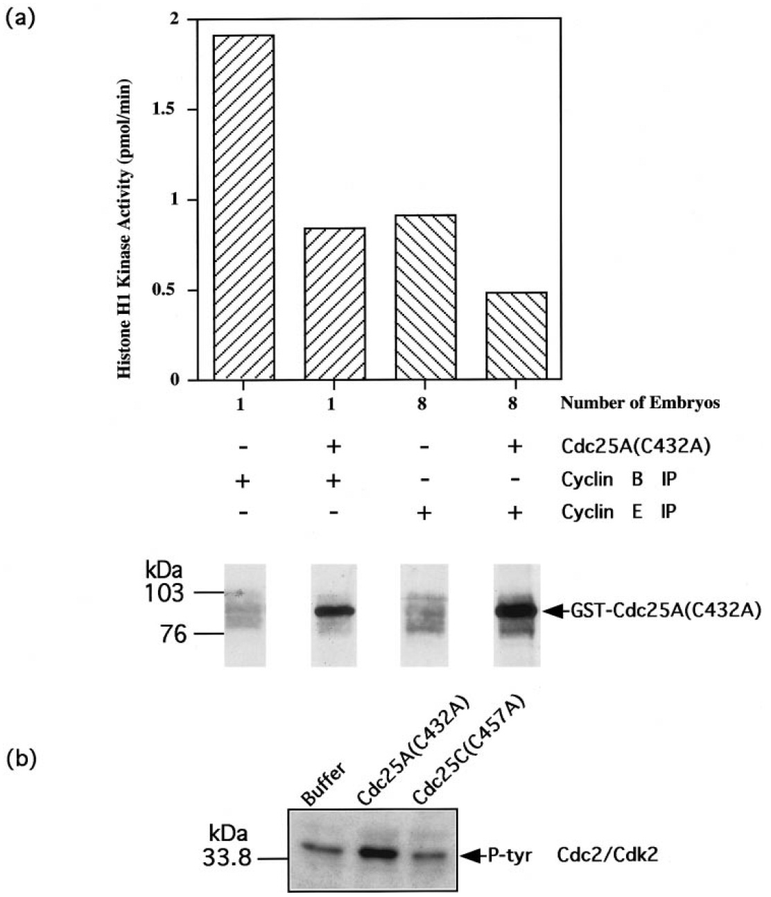 FIG. 5. Phosphorylation and deactivation of Cdc2/Cdk2 following injection of catalytically inactive Cdc25A. (a) Effect of Cdc25A (C432A)