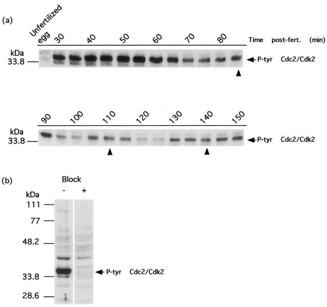 FIG. 6. Periodic Tyr15 phosphorylation of Cdc2/Cdk2 after fertilization. (a) Western blot analysis. Embryo extracts, prepared at the