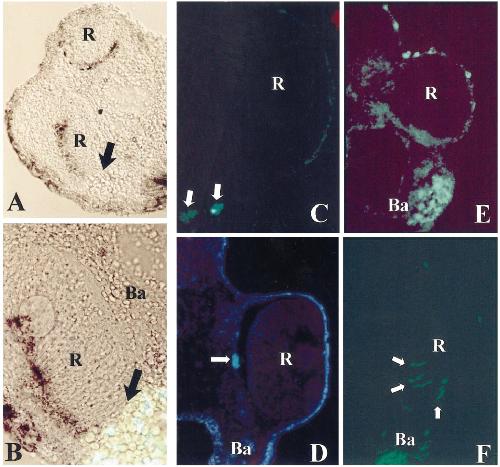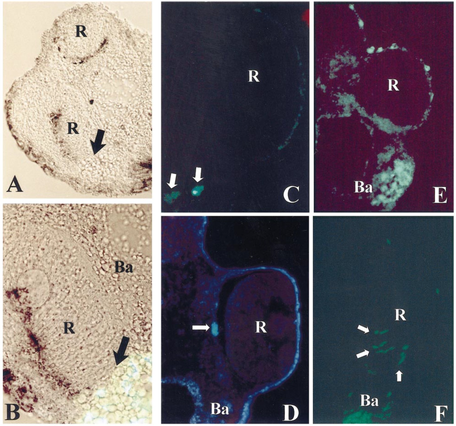 populated the branchial arch mesoderm (Ba) and occasionally populated the retina (R, arrows).