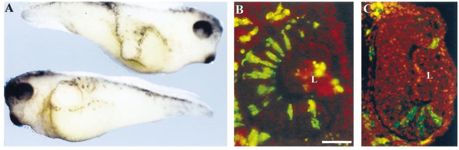 FIG. 5. Transverse sections through stage 37 heads in which vegetal blastomeres were injected with tAR. (A) DIC image at level of the