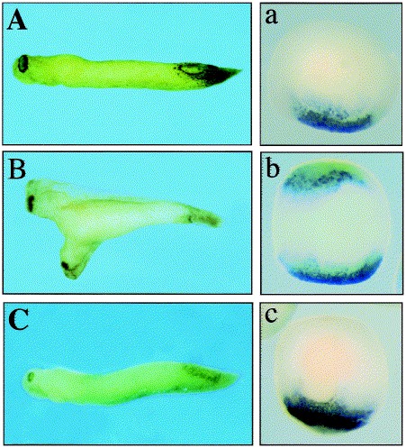 Fig. 1. DWnt-4 counteracts the axis-inducing activity of Wg in Xenopus. Control embryos (A,a) and embryos injected, into the vegetal region of ventral blastomeres at the four-cell stage, with either 5 pg wg mRNA (B,b) or with 5 pg wg mRNA and 6 ng DWnt-4 mRNA (C,c) were left to develop until the tailbud stage (AâC, ventral views) or stained for chd mRNA at the early gastrula stage (aâc). Control embryos possess a single axis and a single cement gland (A). Embryos injected with wg mRNA show fully duplicated axes and two cement glands (B). In embryos co-injected with wg and DWnt-4 mRNAs, the formation of the secondary axis is blocked and a single cement gland is seen (C). At the early gastrula stage, control embryos (a) and those co-injected with wg and DWnt-4 mRNAs (c) show a single dorsal site of chd expression, while embryos injected with wg mRNA alone display in addition a second chd expression site (b).