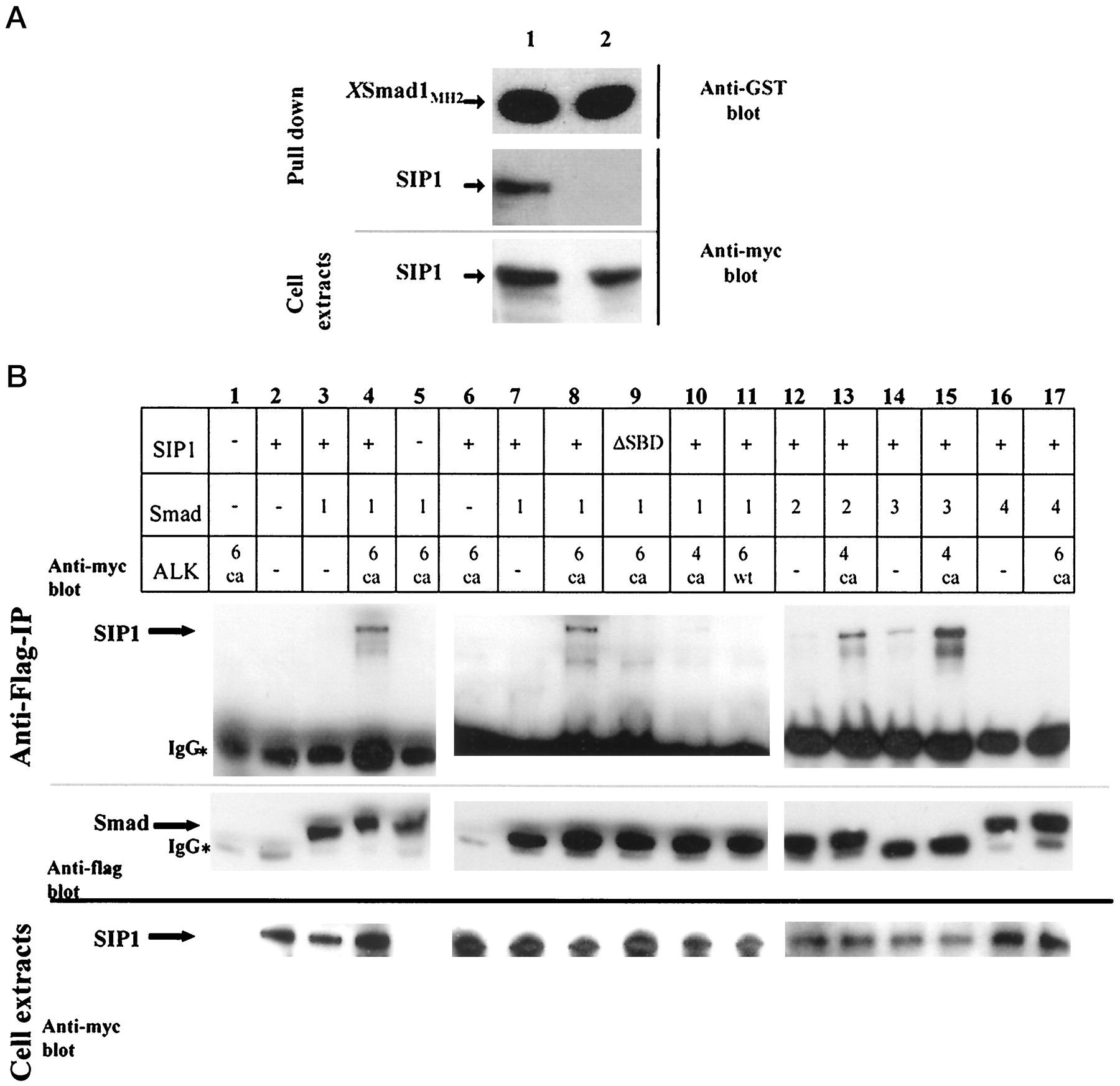 FIG. 5. A, interaction of SIP1 with the MH2 domain of XSmad1 in mammalian cells. An expression construct encoding a fusion between GST and