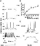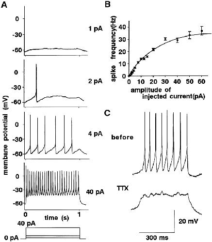 Figure 2. Current-clamp recordings from olfactory receptor neurons in the lateral diverticulum of Xenopus laevis. Current-clamp recordings showing the voltage responses to positive current injections from a conditioning potential of −60 mV (A). Above a certain threshold, repetitive action potential spikes were observed. The number next to the action potentials indicates the amplitude of currents injected. These traces were recorded from the same cell. (B) Spike frequency of olfactory receptor neurons as a function of current injection for six neurons that fired repeatedly. (C) An action potential recorded in response to a positive current pulse (40 pA) from the conditioning potential (−60 mV). This action potential response was reversibly blocked by 1 μM TTX.