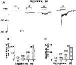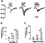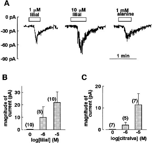Figure 8. Inward currents in response to 1 and 10 μM lilial, and 1 mM alanine (A). All responses to each of the four traces were recorded from the same neurons. The holding potential was −70 mV. Mean magnitude of inward currents to lilial (B) and citralva (C) of varying concentrations. Each point is the mean ± SEM of data obtained from n preparations that responded to the odorants applied. The holding potential was −70 mV.