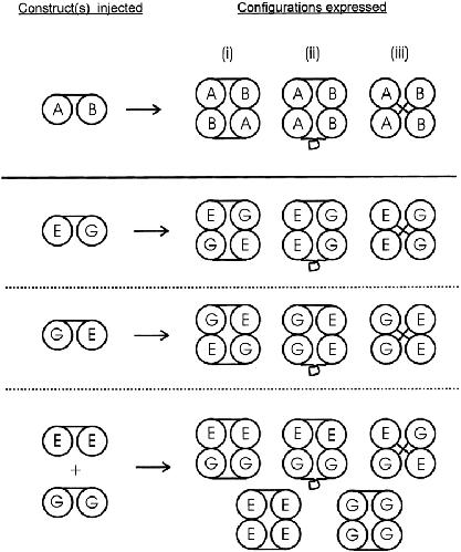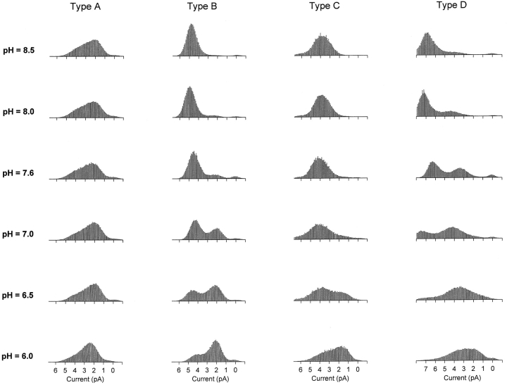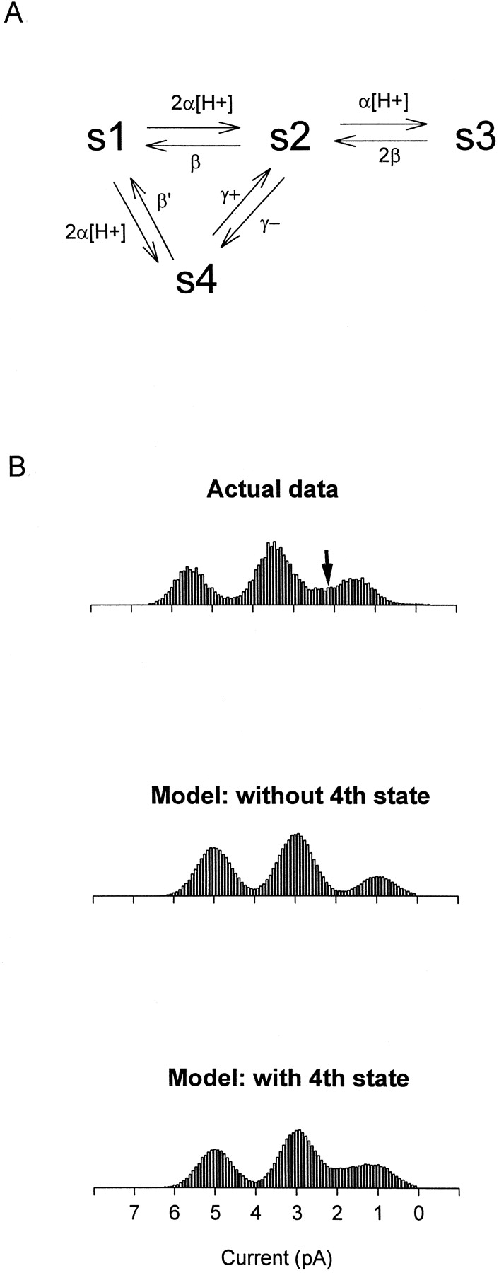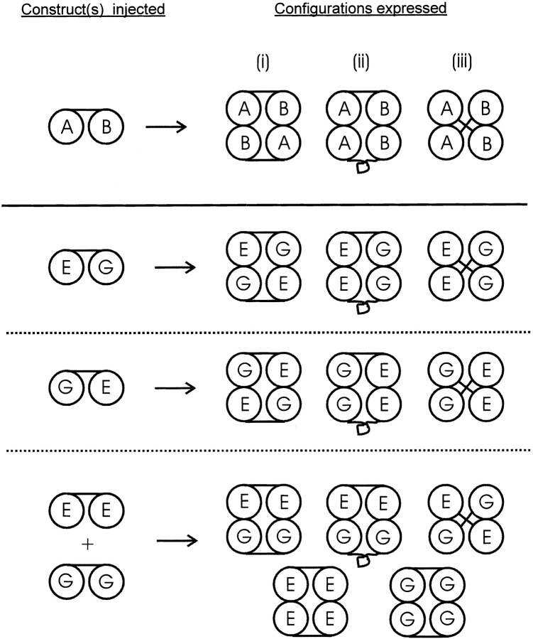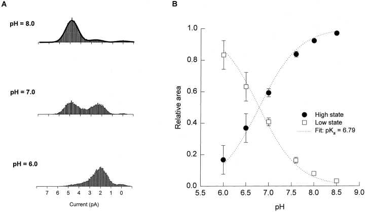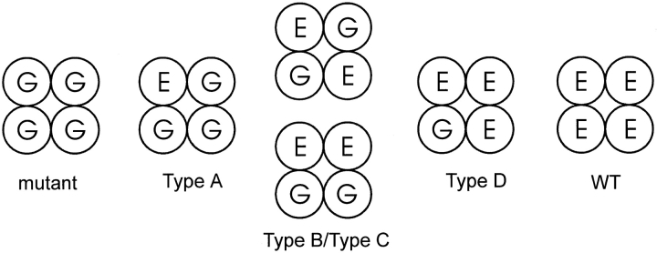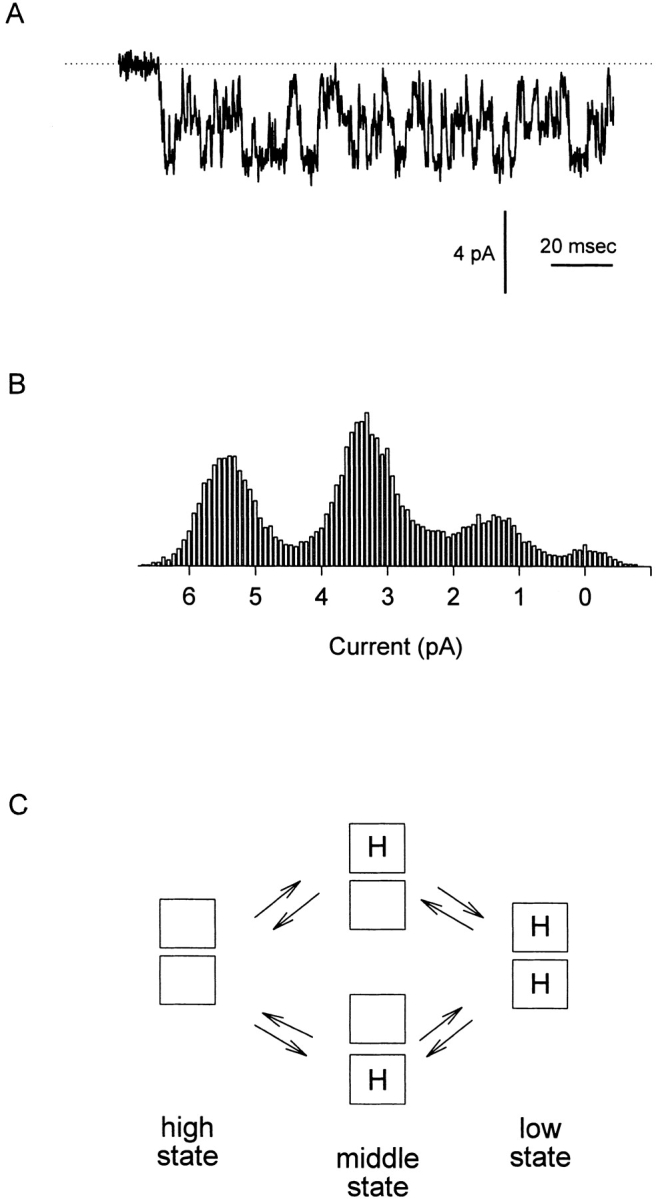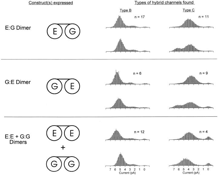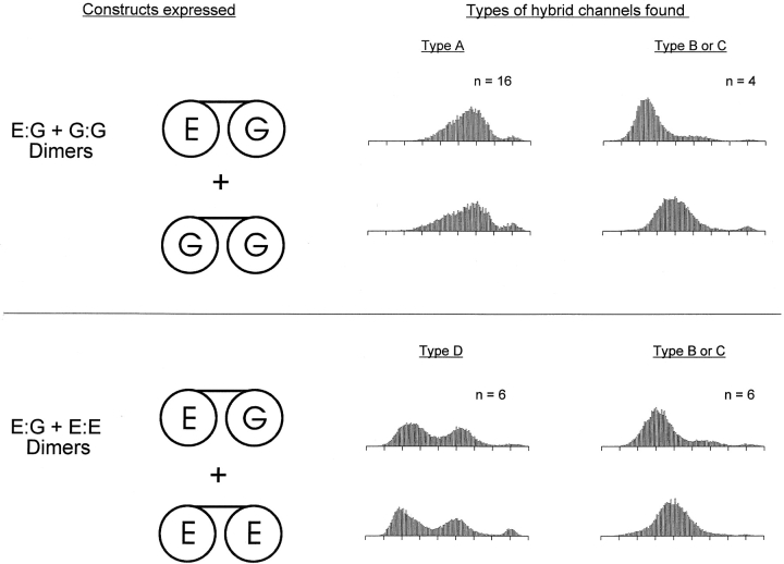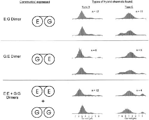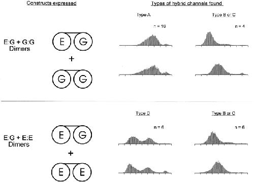 The pore of the catfish olfactory cyclic nucleotide-gated (CNG) channel contains four conserved glutamate residues, one from each subunit, that form a high-affinity binding site for extracellular divalent cations. Previous work showed that these residues form two independent and equivalent high-pKa (approximately 7.6) proton binding sites, giving rise to three pH-dependent conductance states, and it was suggested that the sites were formed by pairing of the glutamates into two independent carboxyl-carboxylates. To test further this physical picture, wild-type CNG subunits were coexpressed in Xenopus oocytes with subunits lacking the critical glutamate residue, and single channel currents through hybrid CNG channels containing one to three wild-type (WT) subunits were recorded. One of these hybrid channels had two pH-dependent conductance states whose occupancy was controlled by a single high-pKa protonation site. Expression of dimers of concatenated CNG channel subunits confirmed that this hybrid contained two WT and two mutant subunits, supporting the idea that a single protonation site is made from two glutamates (dimer expression also implied the subunit makeup of the other hybrid channels). Thus, the proton binding sites in the WT channel occur as a result of the pairing of two glutamate residues. This conclusion places these residues in close proximity to one another in the pore and implies that at any instant in time detailed fourfold symmetry is disrupted.