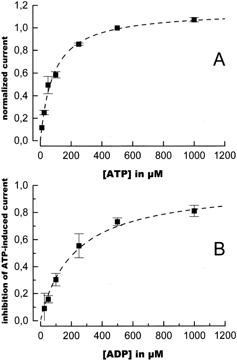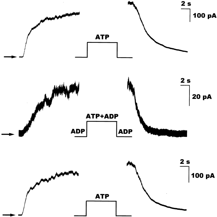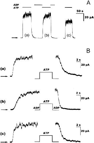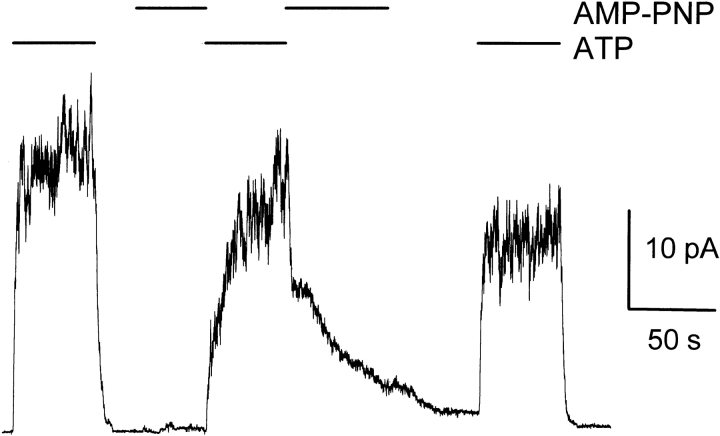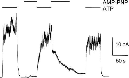The CFTR chloride channel is regulated by phosphorylation by protein kinases, especially PKA, and by nucleotides interacting with the two nucleotide binding domains, NBD-A and NBD-B. Giant excised inside-out membrane patches from Xenopus oocytes expressing human epithelial cystic fibrosis transmembrane conductance regulator (CFTR) were tested for their chloride conductance in response to the application of PKA and nucleotides. Rapid changes in the concentration of ATP, its nonhydrolyzable analogue adenylylimidodiphosphate (AMP-PNP), its photolabile derivative ATP-P3-[1-(2-nitrophenyl)ethyl]ester, or ADP led to changes in chloride conductance with characteristic time constants, which reflected interaction of CFTR with these nucleotides. The conductance changes of strongly phosphorylated channels were slower than those of partially phosphorylated CFTR. AMP-PNP decelerated relaxations of conductance increase and decay, whereas ATP-P3-[1-(2-nitrophenyl)ethyl]ester only decelerated the conductance increase upon ATP addition. ADP decelerated the conductance increase upon ATP addition and accelerated the conductance decay upon ATP withdrawal. The results present the first direct evidence that AMP-PNP binds to two sites on the CFTR. The effects of ADP also suggest two different binding sites because of the two different modes of inhibition observed: it competes with ATP for binding (to NBD-A) on the closed channel, but it also binds to channels opened by ATP, which might either reflect binding to NBD-A (i.e., product inhibition in the hydrolysis cycle) or allosteric binding to NBD-B, which accelerates the hydrolysis cycle at NBD-A.
