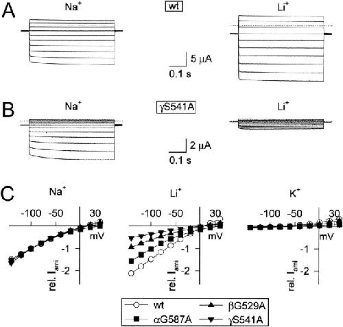 Figure 2. The macroscopic Li+/Na+ conductance ratio is decreased by mutations of homologous residues in α, β, and γ subunits. Current–voltage relationship of amiloride-sensitive currents in two-electrode voltage-clamp recordings from Xenopus oocytes. (A and B) Current traces of ENaC wt (A) and the γS541A mutant (B) in 40 mM Na+ or Li+ solution. Currents were measured during 500-ms voltage steps from a holding potential of −20 mV to test potentials of −140 to +40 mV in 20-mV increments. Currents measured in the presence of amiloride were subtracted from currents measured in the absence of 5 μM amiloride, and these subtracted currents are shown. The dotted line indicates zero level of the amiloride-sensitive current. (C) Current–voltage relationship in 40 mM Li+, 40 mM Na+, or 120 mM K+ bath solution from oocytes expressing wt, αG587A, βG529A, and γS541A mutant ENaC are shown. Recordings were obtained as described in A and B, with the exception that 250 μM amiloride was used to block βG529A currents. For each oocyte, the amiloride-sensitive current was normalized to the INa at −100 mV. INa at −100 mV was 13.9 ± 2.3 μA for wt . |