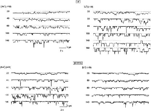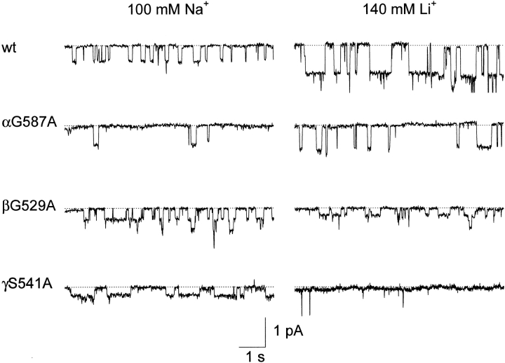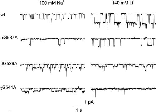Figure 4. Single-channel Li+ and Na+ currents of wt ENaC and the mutants αG587A, βG529A, and γS541A. Traces are from outside-out patches from Xenopus oocytes at a holding potential of −100 (wt, γS541A) or −120 (αG587A, βG529A) mV at 100 mM external Na+ or 140 mM external Li+. The outside-out configuration was chosen to verify amiloride sensitivity of channel activity. |