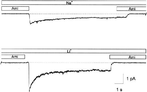 Figure 5. Amiloride-sensitive currents in macropatches from oocytes expressing the βG529S mutant. Subsequent application of extracellular Na+ and Li+ solution with and without 250 μM amiloride to an outside-out patch from an oocyte expressing βG529S ENaC. The holding potential was −80 mV. |