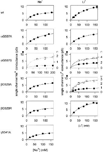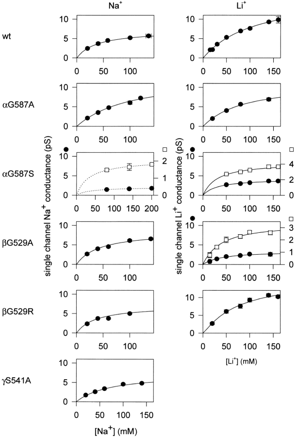Figure 7. Saturation of single-channel conductance with increasing concentration of the permeant ion. Single-channel conductance from outside-out patches from oocytes is plotted versus the extracellular Na+ or Li+ concentration. Conductance was measured from a linear fit to single-channel currents at −70, −100, and −130 mV (wt, αG587A, βG529R) or −90, −120, and −150 mV (βG529A, γS541A). Each data point is from at least three different patches. In many cases, the error bars (SEM) are not visible because they are smaller than the symbol. Solid lines are the predictions by the energy barrier models (Table and Fig. 9). For Na+ permeation through αG587S, the dotted lines represent a fit to the Michaelis-Menten equation. For some mutants, conductance is also shown (□) on an expanded scale, indicated on the right hand ordinate. |