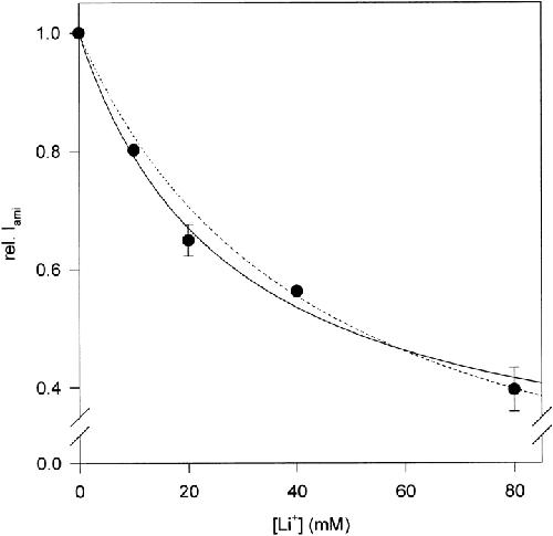 Figure 8. Block of Na+ current through γS541A ENaC by increasing concentrations of external Li+. Data are from outside-out macropatch recordings at a holding potential of −150 mV from Xenopus oocytes expressing γS541A. The bath solution contained 20 mM Na+ and increasing concentrations of Li+. The amiloride-sensitive currents were normalized to the condition without Li+ yielded an apparent Ki of 28 mM and is shown as a solid line. The prediction by the 3B2S model (see Table and methods) is shown as a dotted line. |