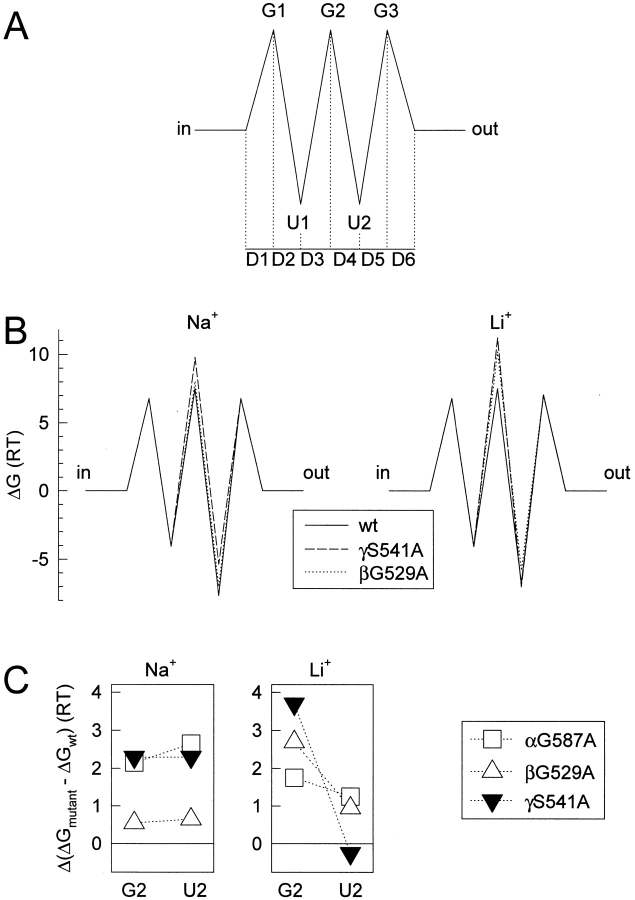 Figure 9. Energy barrier models of Na+ and Li+ permeation through open wt or mutant ENaC. (A) Parameters of the 3B2S model are represented and include: peak energies (G1-G3), well energies (U1, U2), and electrical distances (D1–D6). (B) Energy diagrams are drawn according to best-fit parameter values for the 3B2S model listed in Table . Profiles for wt (solid line), βG529A (dotted line), and γS541A (dashed line) are shown. (C) The ΔG changes relative to wt (Δ[ΔGmutant − ΔGwt]) of G2 and U2, the free parameters in the model fitting, are shown for αG587A, βG529A, and γS541A. |