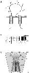 Figure 1. Sequence alignment and structural model of the pore region of ENaC. (A) Linear model of an ENaC subunit showing two transmembrane domains, M1 and M2, with a pre-M2 segment. (B) Sequence alignment of the pre-M2 segments of α, β, γ, δ ENaC, the ASIC family, and FANaC (FMRFamide peptide–gated Na+ channel; Waldmann et al. 1995a) (Waldmann and Lazdunski 1998; Tavernarakis and Driscoll 1997). The number of the first residue shown of rat α, β, γ ENaC, human δ ENaC, rat ASIC1, and FANaC is indicated. The putative start of M2, as predicted by the PHDhtm (transmembrane helix location) program at EMBL-Heidelberg, is indicated. The amino acid residues shown are identical within subunits across the species. Amino acid residues shown in open boxes are conserved across all known genes of the ENaC family. Amino acids analyzed in this study are shown in white on a dark background. Amino acids whose function has been analyzed in previous studies are shown in bold on gray background. αS583 and the homologous amino acid residues βG525 and γG537 change channel affinity for amiloride block (Schild et al. 1997). αS589 is a determinant of the geometry of the narrowest part of the pore (Kellenberger et al. 1999). (C) The cross-section shows the pre-M2 segments and the second putative transmembrane α-helices (M2) of an α subunit (black, center), a β subunit (gray, on the left) and a γ subunit (dark gray, on the right). The second α subunit located on the side of the viewer (Firsov et al. 1998) is not shown. The outer vestibule is lined by the pre-M2 segment where amiloride binds to αS583 and the corresponding Gly residues in the β and γ subunit (Schild et al. 1997). The vestibule narrows down to the selectivity filter formed by αG587, βG529, and γS541 residues and the ring of Ser residues (αS589 and analogues; Kellenberger et al. 1999). |