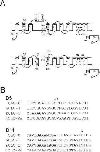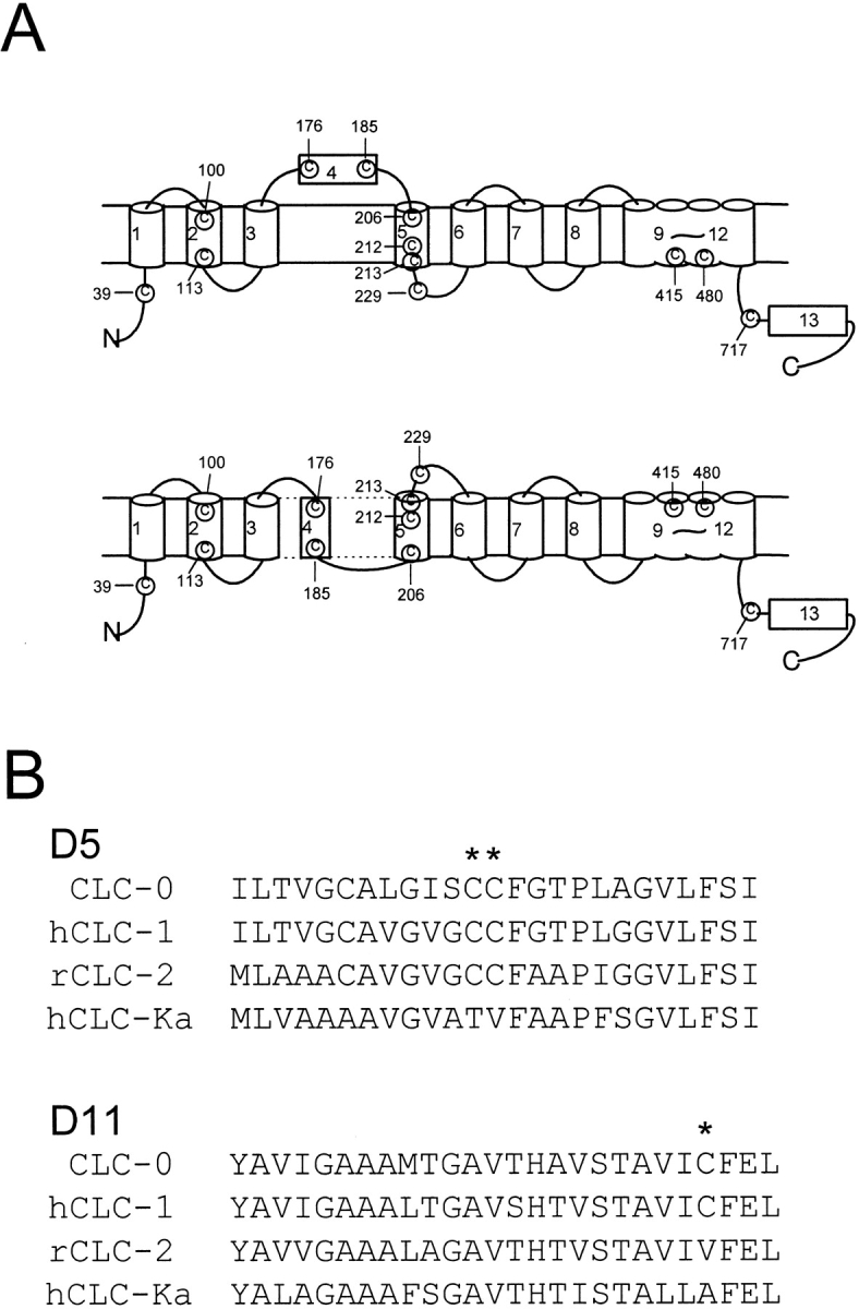 Figure 1. (A) Positions of cysteine residues of ClC-0. The membrane topology of the top panel was drawn according to Schmidt-Rose and Jentsch 1997, whereas the bottom panel was drawn according to Fahlke et al. 1997. Placing the D8–D9 linker in intracellular side (bottom), however, violates the fact that there is a glycosylation site in this linker (Middleton et al. 1994). (B) Alignment of the amino acid sequences of D5 and D11 from several ClC channels. Stars on top of the sequences denote C212, C213 (in D5), and C480 (in D11) of ClC-0. |