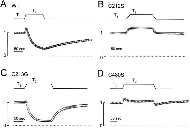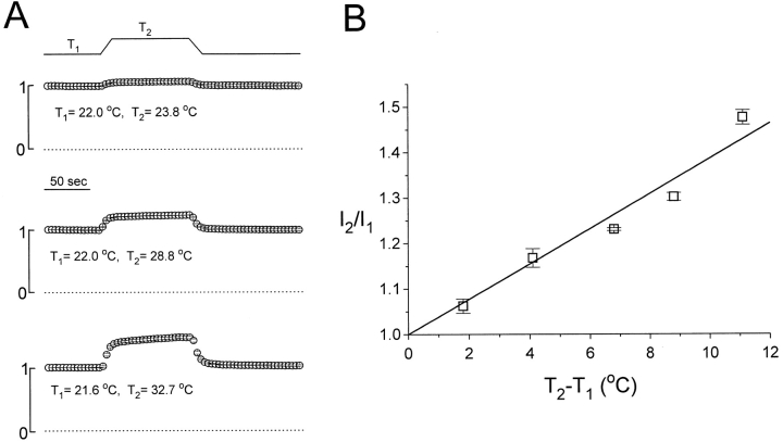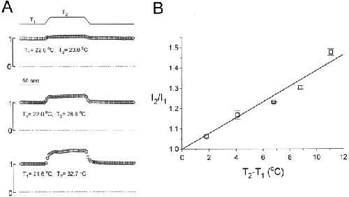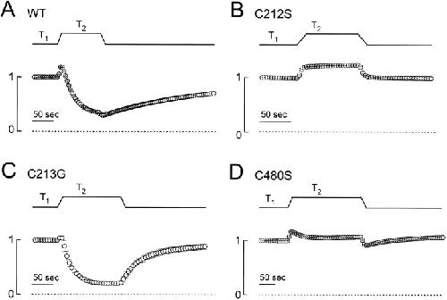 Figure 5. Temperature dependence of the macroscopic current of C212S. (A) Temperature-jump experiments showing different degrees of the increase in the steady state current. All current amplitudes are normalized to the value of the first point and the dotted lines are the zero-current level. All data points were from the average of four measurements. (B) Temperature-dependent increase of the whole oocyte current. I1 was measured right before the increase of the temperature, whereas I2 was measured near the end of the temperature jump. The solid line is the best fit to a linear equation . Data points were from the average of four to six measurements. |
