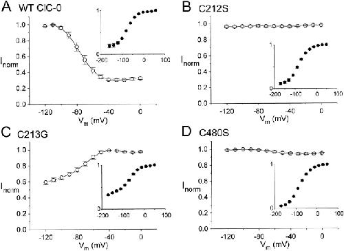 Figure 3. Sensitivity of wild-type ClC-0 and cysteine mutants to extracellular Zn2+ inhibition. (A) Inhibition by 10 μM extracellular Zn2+ on the steady state current of the wild-type channel (WT), C212S, C213G, and C480S. Down- and upward arrows indicate the application and washout of 10 μM Zn2+, respectively. Dotted lines represent zero-current level. (B) Dose-dependent inhibition of Zn2+ for the four channels shown in A. All data points were the average of 3–11 determinations. The current amplitude was normalized to the value right before the application of Zn2+. Solid curves were drawn according to a Langmuir function: , with values of K1/2 and I∞: (wild type) 1.0 μM and 0.87; (C212S) 47.5 μM and 0.33; (C213G) 3.5 μM and 0.78; (C480S) 9.3 μM and 0.88. |