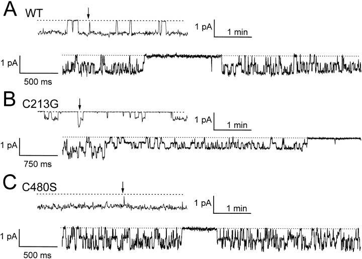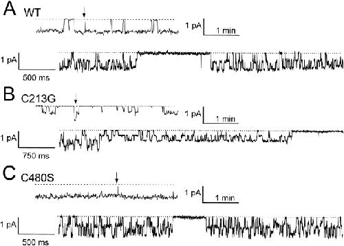 Figure 6. Single-channel recordings of (A) Wild-type ClC-0, (B) C213G, and (C) C480S. Continuous recording from excised inside-out patch at a holding potential of −50 mV. The top of each panel shows a 4-min recording in a compressed time window. The bottom is with an expanded time window starting at the position indicated by the arrow. Note that two C213G channels were present in the patch. The temperature during recording was ∼23–25°C. |