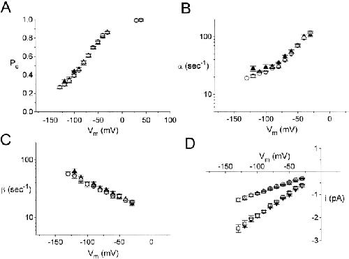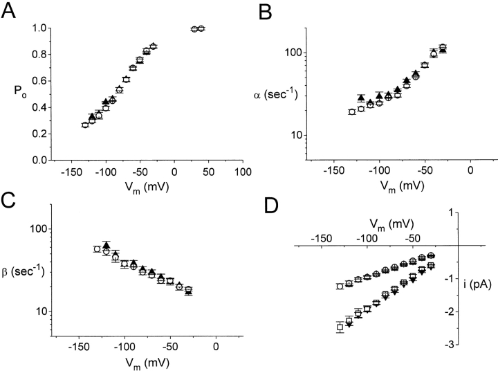 Figure 9. Comparison of single-channel properties of wild-type ClC-0 and C212S. The parameters of the fast gate were calculated from and the single-channel current amplitudes were measured from all-points amplitude histograms. (A) Steady state voltage dependence of the open probability of the fast gate. (B) Opening rate constants of the fast gate as a function of membrane potential. (C) Closing rate constants of the fast gate. (D) Single-channel I–V curves. ○ and ▴ are the current amplitudes of one-pore opening, whereas □ and ▾ are those of two-pore openings. In all panels, solid symbols represent wild-type ClC-0, whereas open symbols are C212S. |