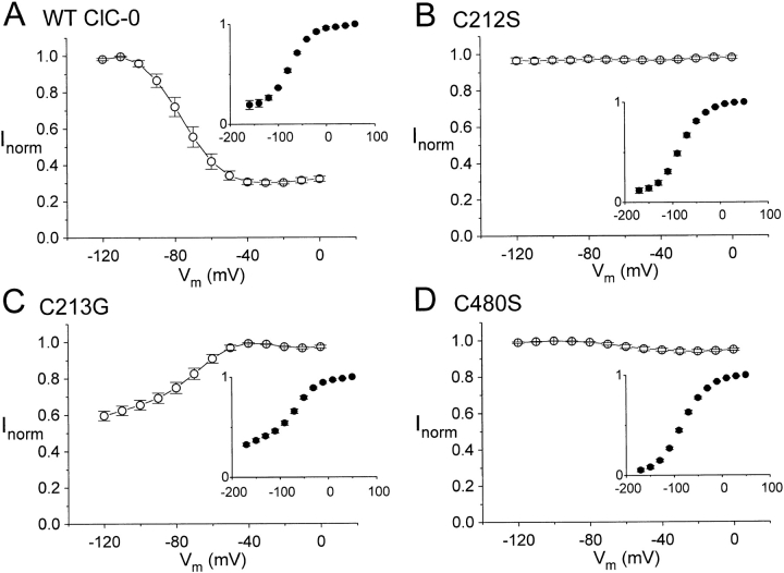 Figure 2. Quasi–steady state activation curves of the slow gate. (A) Wild-type (WT) ClC-0; temperature: 23.7–23.8°C . |