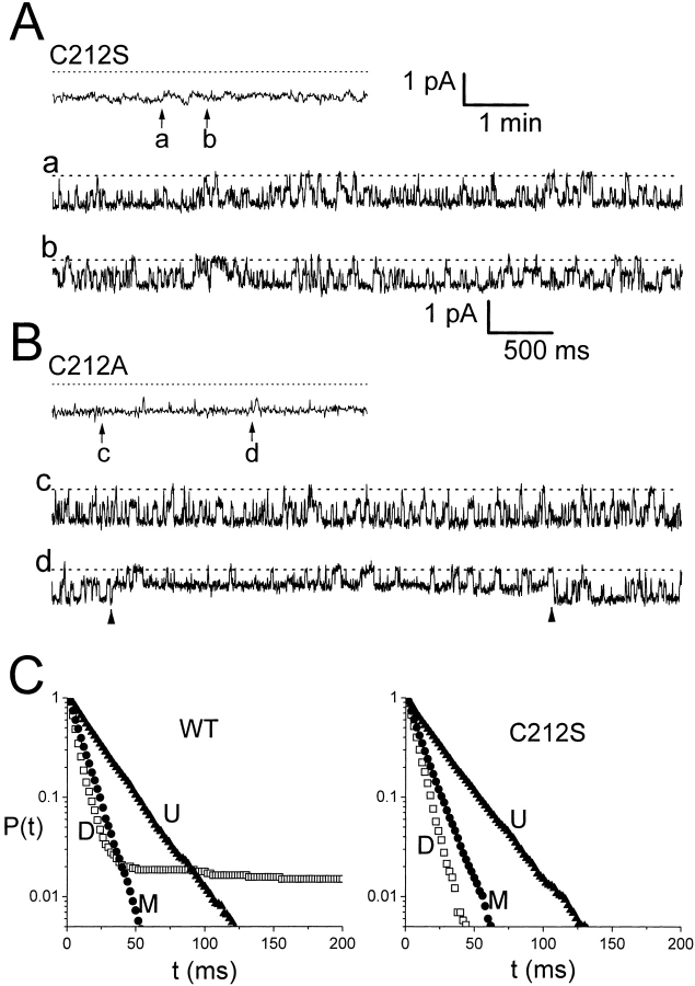 Figure 7. (A and B) Single-channel recordings of C212S and C212A. Continuous recording for 5 min in each case at a holding potential of −50 mV. The top of each panel is in a compressed time window. a–d are the recordings starting at the indicated points (arrows) with an expanded time window. The scale bars for the compressed and expanded time windows in A also apply to B. No inactivation event was discernible in both A and B throughout the whole recordings. Temperature was ∼23–24°C. (C) Comparison of cumulative dwell-time distributions of the events at conductance levels D (□), M (•), and U (▴) between wild-type ClC-0 (left) and C212S (right). The recording trace of the wild-type channel used for analysis is the same as the 4-min trace in Fig. 6 A. For C212S, the analyzed trace is the first 4-min recording shown in A. All events in each of the three levels were used for analysis. The numbers of events in levels D, M, and U are: (wild type) 1,399, 7,009, and 5,612; and (C212S) 1,731, 7,822, and 6,092, respectively. |