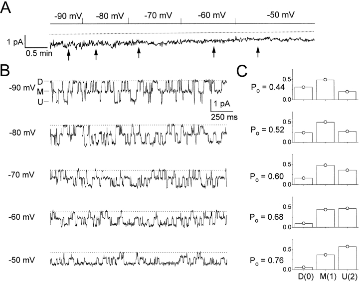 Figure 8. Binomial distribution of the three current levels in C212S. (A) Continuous 6-min single-channel recording trace at various membrane voltages. Same channel as the one shown in Fig. 7 A. The recording at −50 mV corresponds to the first ∼100-s recording in Fig. 7 A. (B) Representative 2-s recording traces starting at the positions indicated by arrows in A. (C) Open probability of the fast gate (Po) and the probabilities of the three current levels, fD, fM, and fU, at membrane potentials from −90 (top) to −50 (bottom) mV. The analysis was made on the corresponding regions shown in A, with the length of each segment being: 44 s (−90 mV), 62 s (−80 mV), 70 s (−70 mV), 72 s (−60 mV), and 106 s (−50 mV). The measured state probabilities, fD, fM, and fU, are represented by bars, whereas ○'s denote f0, f1, and f2, the predicted values of state probabilities calculated from Po. |