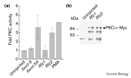 RNAs that induce PKC translocation also increase PKC activity in an in vitro kinase assay. (a) Relative phosphorylation of a PKC substrate peptide by immunoprecipitated XPKCα–Myc from embryos co-injected with RNA encoding either Xwnt-8 (n = 3 experiments), Xwnt-5A (n = 3), Rfz1 (n = 3) or Rfz2 (n = 6). As we wanted to measure relative kinase activities, uninjected embryos (n = 8) were measured for basal kinase activity, and this level was set to 1. PMA was added to the reaction tubes as a positive control. (b) Embryo lysates from panel (a) were immunoblotted with an anti-Myc monoclonal antibody, 9E10, to confirm equal expression of PKC after Frizzled injection.