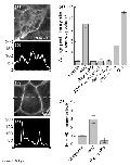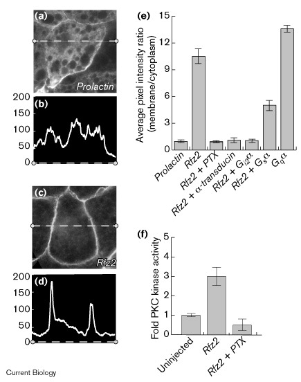 Agents that block Gi or Go-βγ subunit signaling block Rfz2-induced PKC translocation. Two-cell Xenopus embryos were injected with RNAs encoding XPKCα–GFP, Rfz2, and either pertussis toxin, α-transducin, Gi2α, Gsα or prolactin. (a,c) Examples of confocal images used. (b,d) Images (17 different cells from 4 different experiments for each condition in (e); see also Supplementary material published with this paper on the internet) were analyzed using NIH Image software to plot the pixel intensity profile (y-axis: 0 = black, 255 = white) over a linear section of the cell (dashed lines in (a,c) as representative cells). (e) The average pixel intensity of membrane regions divided by the average pixel intensity of intracellular regions was used as a relative measure of PKC membrane localization. (f) Confirming the results in (e), injection of PTX was also able to reduce PKC activity in Rfz2-injected embryos, as measured directly by the independent in vitro kinase assay.