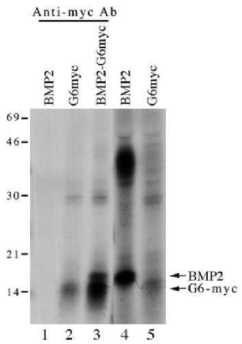 proteins (lane 3). Lanes 4 and 5 are markers for BMP2 and G6myc,