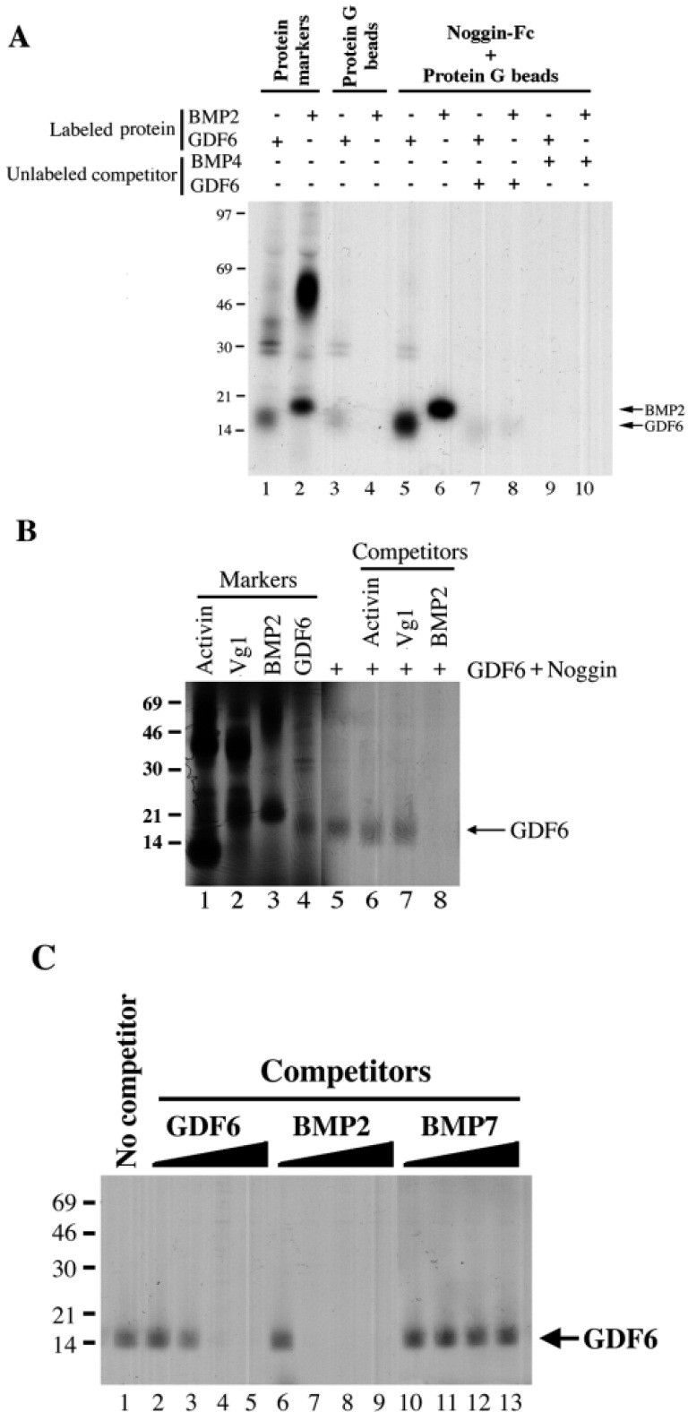 BMP7. Lane 1 is binding of 35S-labeled GDF6 to noggin-Fc in the