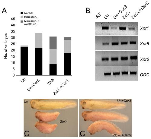 Fig. 6. Rescue of Zic2-depletion by injection of CerS. (A) Analysis of microcephaly (microceph.) and axial truncations (axial trunc.) in control stage 33 embryos (Un), controls injected with 50 pg CerS mRNA (Un+CerS), Zic2-depleted embryos (Zic2-) or Zic2-embryos injected with 50 pg CerS mRNA (Zic2-, +CerS). Data were pooled from two host-transfer experiments. Bars represent the number of embryos with the indicated phenotype. Axial truncations were present in a subset of embryos with microcephaly. (B) Expression of Xnr1, Xnr5 and Xnr6 in gastrula (stage 10.5) stage embryos analyzed by RT-PCR. (C,Câ²) Examples of embryos from the experiment in B. Zic2-embryos show both microcephaly and axial truncation; the Zic2-, +CerS embryos represent a normal and a microcephalic embryo (upper and lower embryo, respectively).