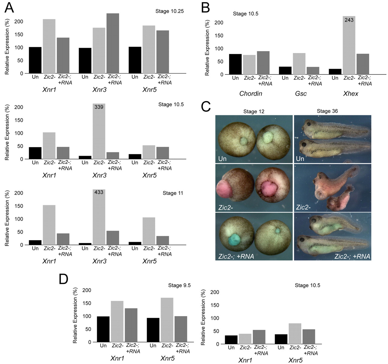 Fig. 4. Rescue of Xnr expression and normal development by injected Zic2 mRNA. (A) Expression of Xnr1, Xnr3 and Xnr5 in uninjected controls (Un), Zic2-depleted embryos and Zic2-depleted embryos (5 ng 10MP) injected with Zic2 mRNA (75 pg into oocytes prior to host transfer). Expression values are relative to the uninjected stage 10.25 sample. (B) Expression of Chordin, Gsc and Xhex in the same samples as A. (C) Examples of embryos from the experiment in A,B shown at two stages, late gastrula (stage 12, left panels) and tailbud (stage 36, right panels). (D) Expression of Xnr1 and Xnr5 in a second rescue experiment, as in A, except that 200 pg of Zic2 mRNA was used.