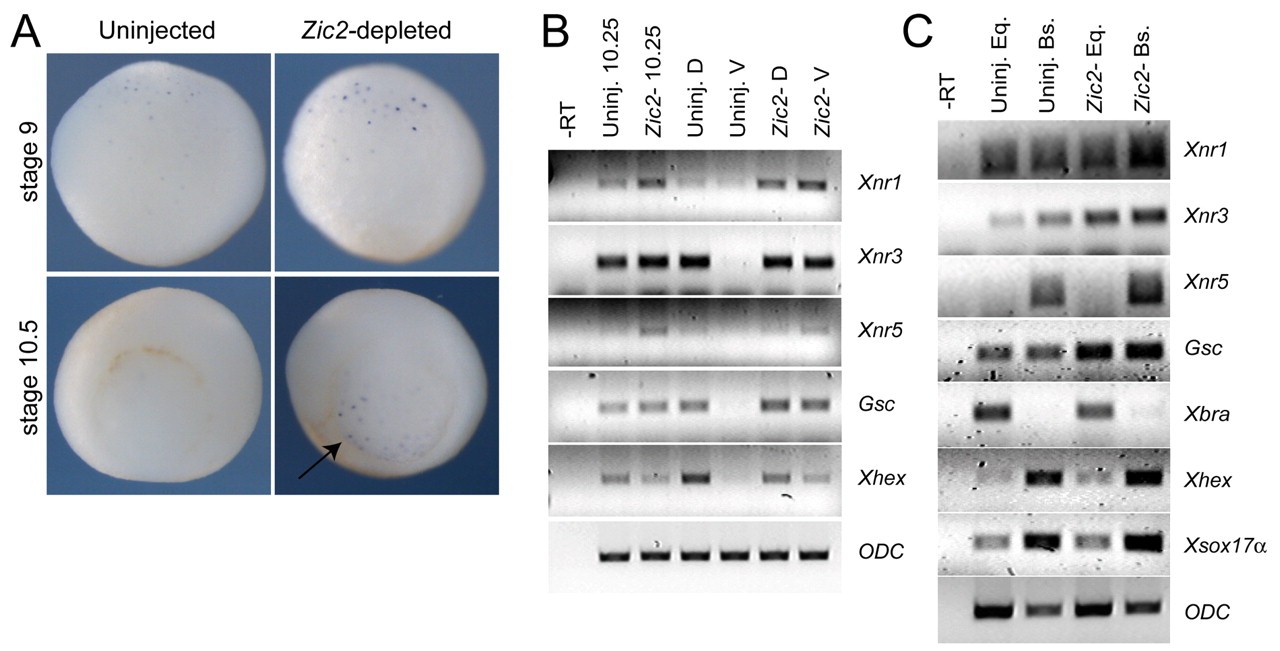 Fig. 5. Increased Xnr expression in Zic2-depleted embryos is restricted to vegetal cells. (A) Xnr5 in situ hybridization at stages 9 (upper panel) and 10.5 (lower panel). Dorsal is oriented towards the top of the figure. Xnr5 is expressed in dorsal vegetal cells of uninjected and Zic2-depleted embryos. Xnr5 expression at stage 10.5 is undetectable in control embryos (0/11) but is present ventrally in Zic2-depleted embryos (8/13; arrow). (B) Expression of Xnr genes and Xnr target genes in dorsal (D) and ventral (V) halves at stage 10.25. Uninjected (Uninj.) 10.25 and Zic2-depleted (Zic2-) 10.25 are intact embryos. âRT, stage 10.25 sample processed in the absence of reverse transcriptase. All genes shown are expressed ventrally. (C) Expression of Xnr genes and Xnr target genes in equatorial (Eq) and vegetal base (Bs) explants.