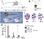 Fig. 1. Isolation and dominant-interfering activity of a truncated Zic2 cDNA. (A) Upper panel: diagram showing the Xenopus Zic2 protein compared with the tZic2 protein. Lower panel: partial alignment of the amino acid sequences of the full-length and truncated-Zic2 proteins. Two potential starting methionines are boxed. The start of the zinc-finger domain is underlined. (B) In vitro translation of tZic2. Two preparations of tZic2 plasmid were translated in transcription-translation coupled reactions. Luciferase (Luc), â¼50 kDa. (C) Injection of tZic2 causes microcephaly and cyclopia. Uninjected and tZic2-injected (500 pg) embryos at stage 40. (D) Hematoxylin and Eosin stained sections from the embryos in C showing reduced forebrains (large arrowhead) and abnormal or cyclopic eyes (small arrowhead). (E) Real-time RT-PCR analysis of neural crest (Slug, Sox9, Twist) and neural (NCAM) marker expression in animal caps cultured to stage 22. Samples and amounts injected are indicated in the key. Relative expression values; samples were normalized to ODC and expressed as a percentage of a whole stage 22 embryo sample.