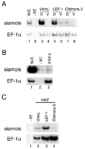 expression of siamois. -RT (lane 1), uninjected (lane 2), LEF-1