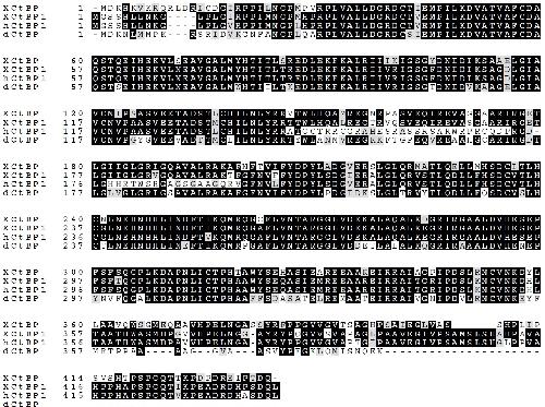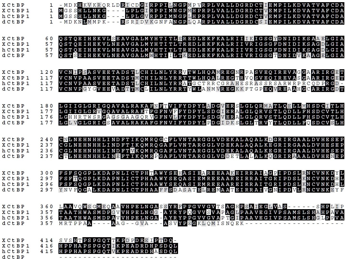 Fig. 3. Amino acid sequence of Xenopus CtBP compared with Xenopus and human CtBP1 and Drosophila CtBP. The Xenopus sequence