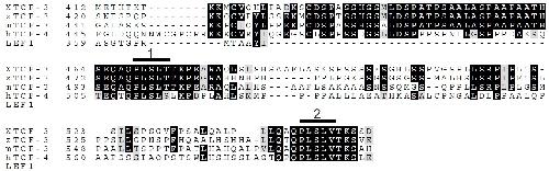 Fig. 6. Amino acid sequence comparison of the C-terminal region of Xenopus, zebrafish and mouse Tcf-3, human Tcf-4 and human LEF-1.
