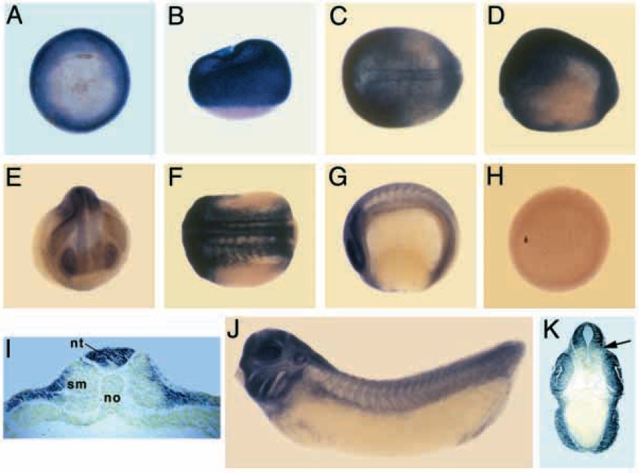 of Xnot transcripts along the dorsal midline (arrow). (J) A stage 11.5