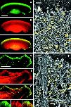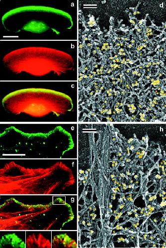 Figure 3. Localization of Arp2/3 complex in lamellipodia. (a–c and e–g) Fluorescence microscopy of Xenopus keratocyte (a–c) or fibroblast (e–g). Staining with p21 antibody (green) and TRITC-phalloidin (red) shows ARP2/3 complex highly enriched in lamellipodia. Boxed region in g is enlarged in insets; it shows several filopodia lacking and only one filopodium containing Arp2/3 complex. (d and h) Immuno-EM of lamellipodia of Xenopus keratocyte (d) or fibroblast (h) stained with p21 primary antibody and 10-nm gold-conjugated secondary antibody after glutaraldehyde fixation and SDS treatment of detergent-extracted cells. Gold particles are highlighted in yellow. Bars: (a and e) 10 μm; (d and h) 0.1 μm. |
