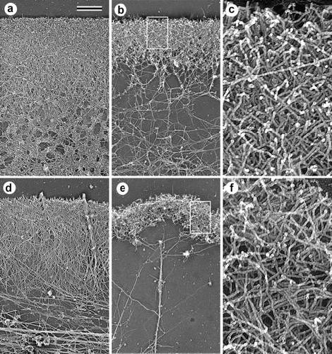Figure 6. Structural differentiation of actin network in lamellipodium. EM of Xenopus keratocytes (a–c) or Xenopus fibroblasts (d–f) after regular extraction in the presence of PEG and phalloidin (a and d) or after unprotected extraction without PEG and phalloidin (b, c, e, and f). Boxed areas from b and e are enlarged in c and f, respectively. Actin network at lamellipodial rear disassembled in the course of unprotected extraction, whereas front zone remained as dense as in control cells. Bar, 1 μm. |