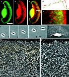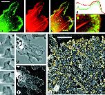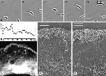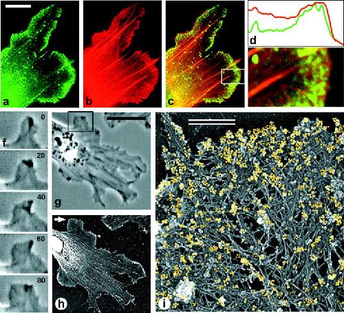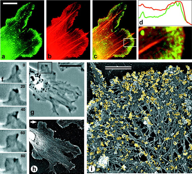 Figure 10. Localization of XAC in Xenopus fibroblasts. (a–e) Fluorescence microscopy of a cell fragment (a–c) and the intensity profile (d) of the enlarged lamellipodium (e) from the boxed region in c, double stained with XAC antibody (green) and TRITC-phalloidin (red). XAC is distributed throughout the entire lamellipodium. (f and g) Phase-contrast sequence showing protruding lamellipodium of a motile cell (f) and the overview of the same cell (g) at 80 s time point. (h and i) Immuno-EM with XAC antibody of the cell shown in g. (h) Cell overview. Nucleus and surrounding regions look bright because of high content of cellular proteins, which creates high electron density (brightness in inverted contrast). Immunogold-labeling in these central regions is very low. (i) High magnification of the protruding region pointed to by arrow in h. Gold particles (yellow) revealing XAC localization are found at the extreme leading edge, as well as throughout the lamellipodia. |
