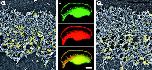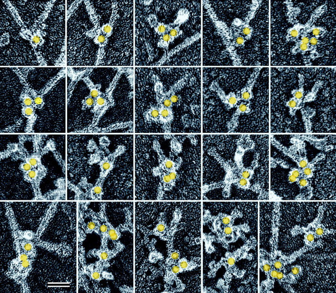 Figure 4. Localization of Arp2/3 complex at actin filament branching points. Xenopus keratocytes and fibroblasts were treated with CD (0.2 μM for 30 min or 0.5 μM for 10 min), extracted in the presence of phalloidin, fixed with glutaraldehyde, treated with 33% methanol, and immunostained with p21 antibody followed by 10-nm gold-conjugated secondary antibody. Gold particles are highlighted in yellow. Bar, 50 nm. |
