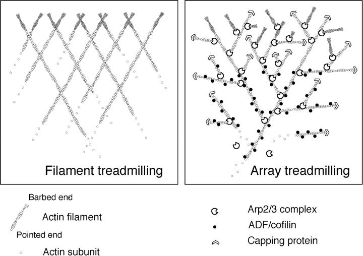 Figure 11. Two treadmilling models for actin turnover in lamellipodia. Left, treadmilling of individual filaments suggests that each actin filament in the actin network simultaneously assembles subunits at its barbed end and releases subunits from the pointed end, thus continuously reproducing itself by treadmilling mechanism. Treadmilling of individual filaments collectively results in the treadmilling of the lamellipodial network. Right, treadmilling of the dendritic array suggests frequent formation of new filaments by de novo nucleation, which occurs within the narrow zone at the leading edge, the actin brush. Newborn filaments become immediately incorporated into the actin array as branches of pre-existing filaments. Within the actin brush, filaments are protected from depolymerization at pointed ends. Nucleation, cross-linking, and pointed end capping are proposed to be mediated by the Arp2/3 complex. Many barbed ends are predicted to be capped to prevent exponential increase in filament mass. Release of the Arp2/3 complex from Y-junctions behind the actin brush, followed by ADF/cofilin-mediated dissociation of actin subunits from pointed ends, may be a major pathway for actin array disassembly. By this model, an individual filament in the dendritic array does not treadmill, but rather first grows at the barbed end and later shrinks at the pointed end. However, the actin filament array as a whole treadmills, reproducing itself at the cell front and dismantling itself at the lamellipodial rear. Growing barbed ends are shaded in gray. |