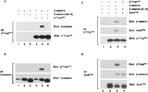 β-Trcp forms a complex with β-catenin and Axin in vivo. (A and B) Association between β-Trcp and β-catenin. (A) Immunoprecipitation of β-Trcpmyc with an anti-myc antibody. Embryo extracts were from stage 9 embryos expressing β-catenin, β-catenin (SâA), or β-Trcpmyc alone or in combination. The precipitates were examined for β-catenin (Upper) and for β-Trcpmyc (Lower). A longer exposure revealed that β-Trcpmyc also coprecipitated endogenous β-catenin (data not shown). (B) Immunoprecipitation of β-catenin using the same embryo extracts as in A. The precipitates were examined for β-Trcpmyc (Upper) and for β-catenin (Lower). Endogenous β-catenin is seen in lanes 1 and 4. RNA injected per embryo: 1 ng each for β-catenin, β-catenin (SâA), and β-Trcpmyc. (C and D) A complex formation between β-Trcp and Axin mediated by β-catenin. (C) Immunoprecipitation of β-Trcpmyc. The extracts were from stage 9 embryos expressing β-Trcpmyc plus AxinFlag in the presence or absence of β-catenin or β-catenin (SâA). The precipitates were examined for β-catenin (Top), AxinFlag (Middle), and β-Trcpmyc (Bottom). (D) Immunoprecipitation of AxinFlag using the same extracts as in C. The precipitates were examined for β-Trcpmyc (Top), β-catenin (Middle), and AxinFlag (Bottom). RNA injected per embryo: same as in A and B except 2 ng for AxinFlag.