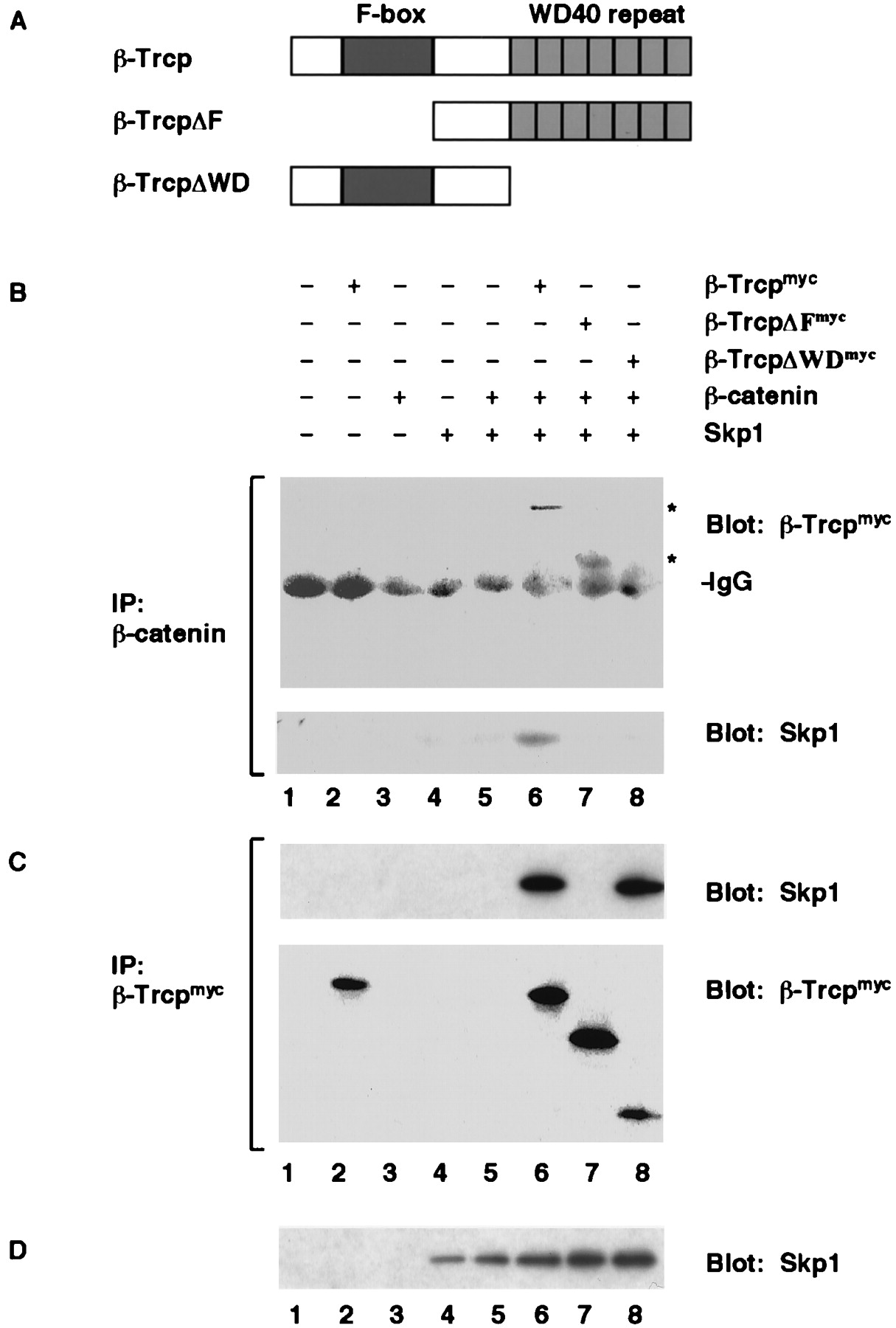 β-Trcp forms a complex with both β-catenin and Skp1. (A) Schematic diagram of wild-type β-Trcp, β-TrcpδF, and β-TrcpδWD. (B) Immunoprecipitation of β-catenin. The precipitates were examined for β-Trcp (Upper) and Skp1 (Lower). A longer exposure revealed that endogenous β-catenin also precipitated β-Trcpmyc (data not shown). (C) Immunoprecipitation of β-Trcpmyc using the same embryo extracts as in B. The precipitates were examined for Skp1 (Upper) and β-Trcp (Lower). (D) Immunoblot of Skp1 in the same embryo extracts as in B. RNA injected per embryo: 1 ng each for β-Trcpmyc and for deletion mutants β-catenin and Skp1.