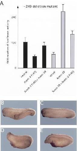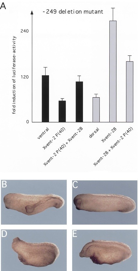 Fig. 6. Effects of Xvent-2B but not of Xvent-1B can be overcome by Xvent-2 P(40). (A) Luciferase activity of -249 Xvent-1B/Luc construct after injection (20 pg) into both dorsal or ventral blastomeres of four- cell stage embryos. Co-injections have been performed with 500 pg Xvent-2 P(40) and/or 200 pg Xvent-2B RNA. (B) Phenotype of Xeno- pus embryos ventrally injected with 1 ng Xvent-2 P(40) RNA (B) or 1 ng Xvent-2 P(40) plus 200 pg of Xvent-1B RNA(C). Note that formation of double axis is completely abolished. Phenotype after dorsal injection of 200 pg Xvent-1B RNA (D) or 200 pg Xvent-1B plus 1 ng Xvent-2 P(40) RNA (E). Note, that Xvent-2 P(40) cannot prevent the ventralization caused by Xvent-1B.