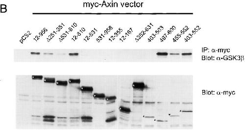 Figure 1. In vivo interaction of Myc-tagged Axin and mutant Axin constructs with endogenous β-catenin (A) or GSK3β (B). Myc-tagged Axin constructs were expressed in 293 cells. Cell lysates were immunoprecipitated with anti-Myc mAb and immunoprecipitates were analyzed for endogenous β-catenin or GSK3β by Western blot (upper panels in A and B). Expression of the transfected Mycâ Axin constructs (asterisks) is shown in the lower panels. |